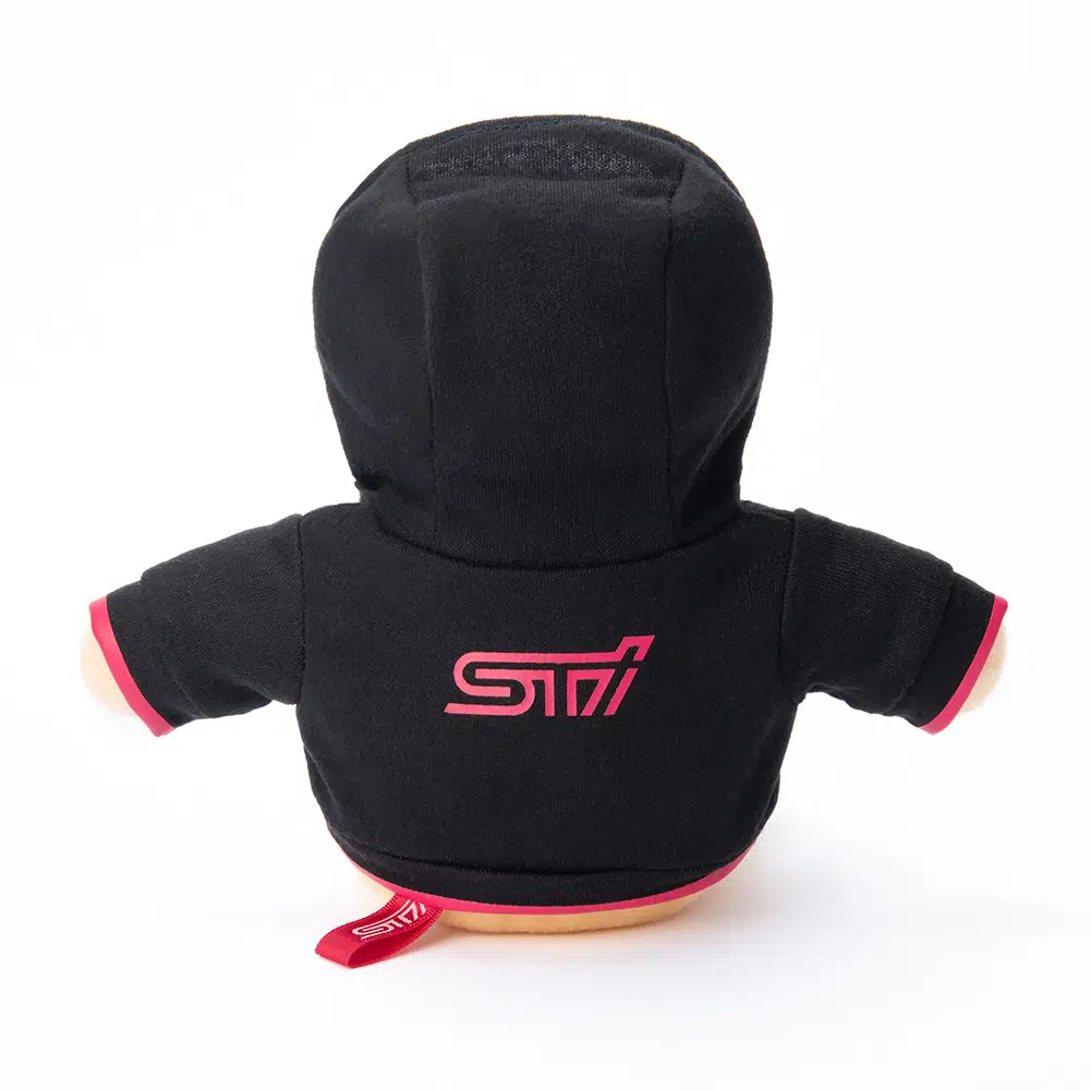 今回のベアには、STIの人気アイテム「STIスウェットパーカー」と「フラットキャップ」をまとい、