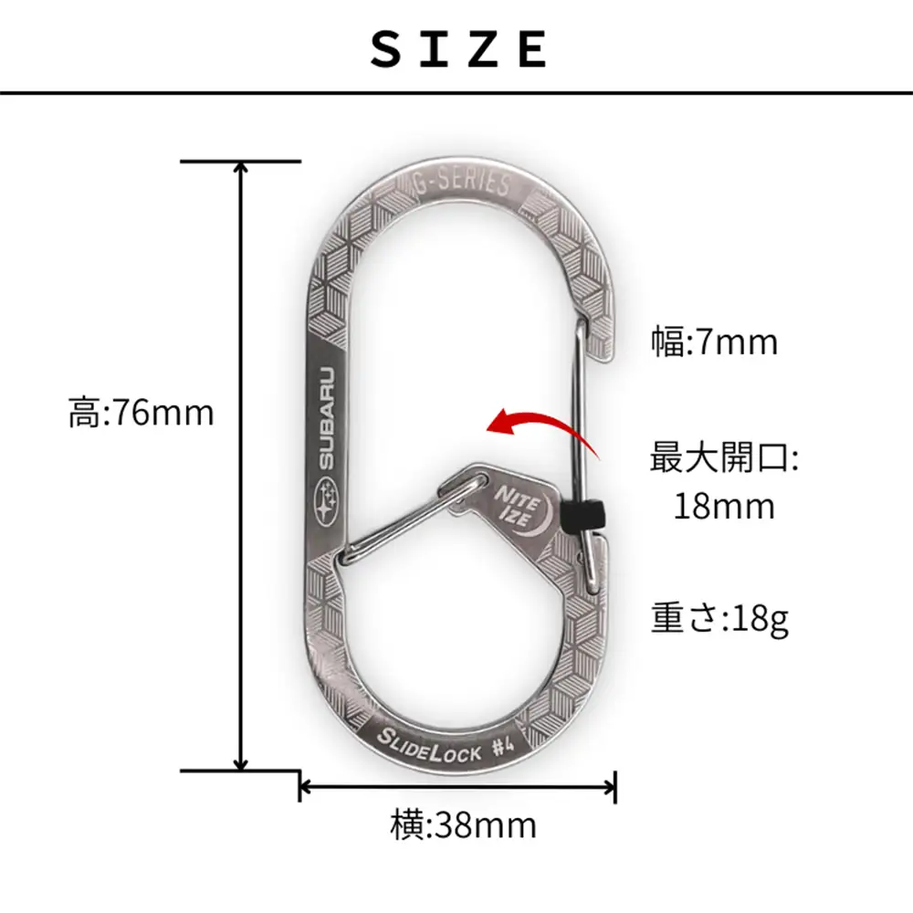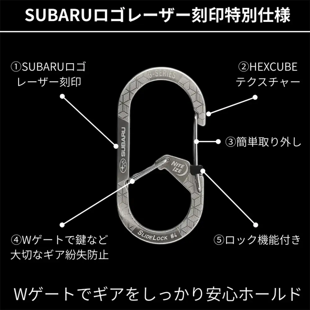 NITE IZE(ナイトアイズ)社製のカラビナ「G-SERIES」にSUBARUロゴとHEXCUBEテクスチャーを配した、普段使いからキャンプまで幅広い範囲で使える、ロック機構を備えたカラビナです。