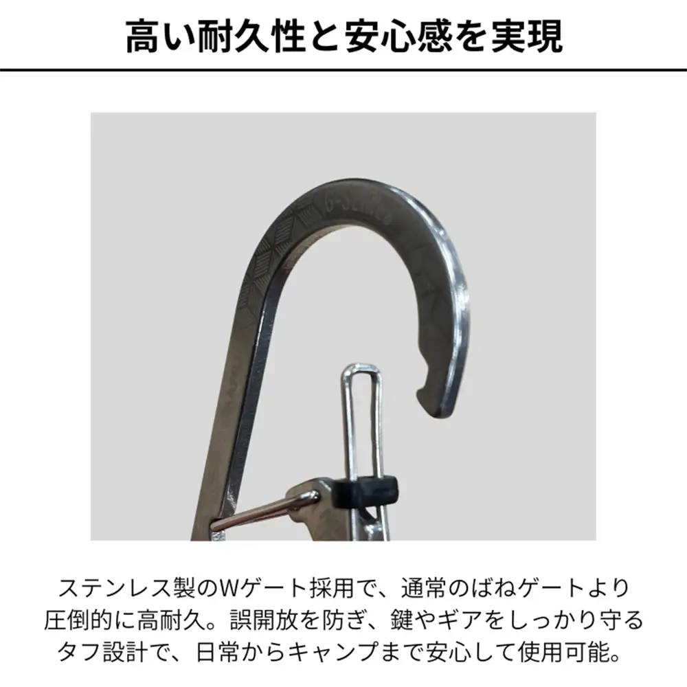 G-SERIESは2段階ゲートを採用したG型のカラビナで、上部には取り出しやすくしたいものを、下部には紛失を防ぎやすくしたいものをといった形で、2通りに分けてひっかけることができます。