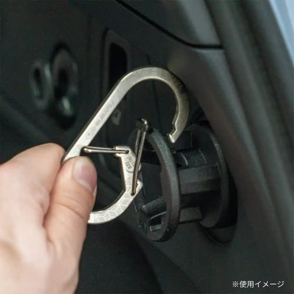 『よりシンプルに、より安全に、そしてもっと楽しく』というNITE IZE社のポリシーに感銘を受け、今回のコラボが実現。NITE IZEのカラビナは一般的なカラビナに使われるスプリングでのゲート開閉ではなく、ステンレス製のゲートをねじったものを使用しています。それ自体をバネにすることで経年劣化によるゲートのゆるみが起こりにくいため、長くお使いいただけます。