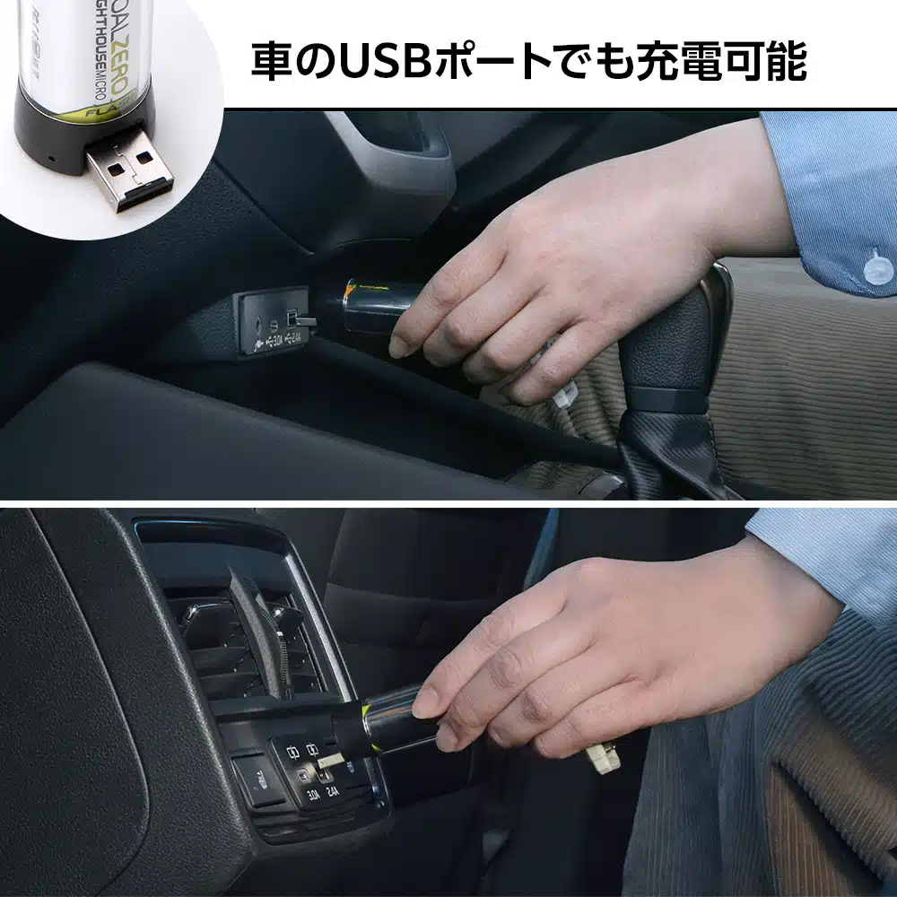 USB充電式で、USBポート(Type-A)を備えたSUBARU車の車内電源からも手軽にチャージ可能。明るさを調整すれば、最長170時間の連続点灯も可能です。